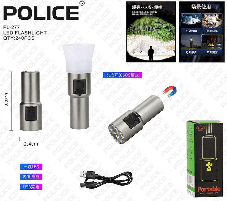 Ручний ліхтар Police PL-277, F36, акумуляторний + біле/червоне/помаранчеве/синє світло + Type-C — це ваш незамінний помічник у будь-якій ситуації, коли потрібне надійне освітлення. Оптом.