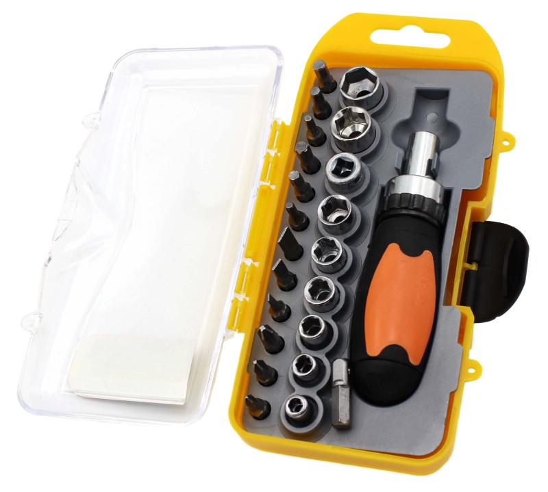 З допомогою цього набору ви зможете без труднощів закручувати і відкручувати гвинти будь-яких типів. Наявність 23 головок і біт робить його універсальним помічником в будь-якому господарстві. Замовити цей набір можна в нашому інтернет-магазині, де також представлені відгуки задоволених покупців, які підтверджують високу якість продукту.