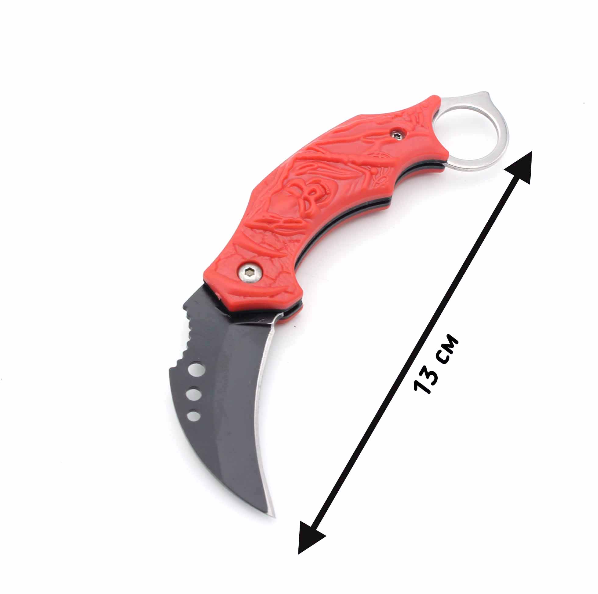 Розкладний ніж із міцної сталі. У розкладеному вигляді має розмір 12 см, розмір леза 4 см. Передбачено кільце для підвішування, а також фіксатор на ремінь. Має вигнуту форму. При використанні не складається довільно, оскільки передбачено запобіжник. Товар в індивідуальній коробці.