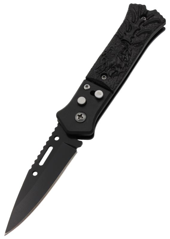 Крім того, чорний колір ножа надає йому строгий і стильний вигляд, що особливо цінується серед людей, які віддають перевагу функціональному та естетично привабливому інструменту. Викидний механізм з типом замка Button-Lock забезпечує надійне закріплення леза, що мінімізує ризик випадкового закриття або відкриття під час використання. Ніж можна безпечно носити в кишені або на поясі, не переймаючись про його випадкове розкриття.