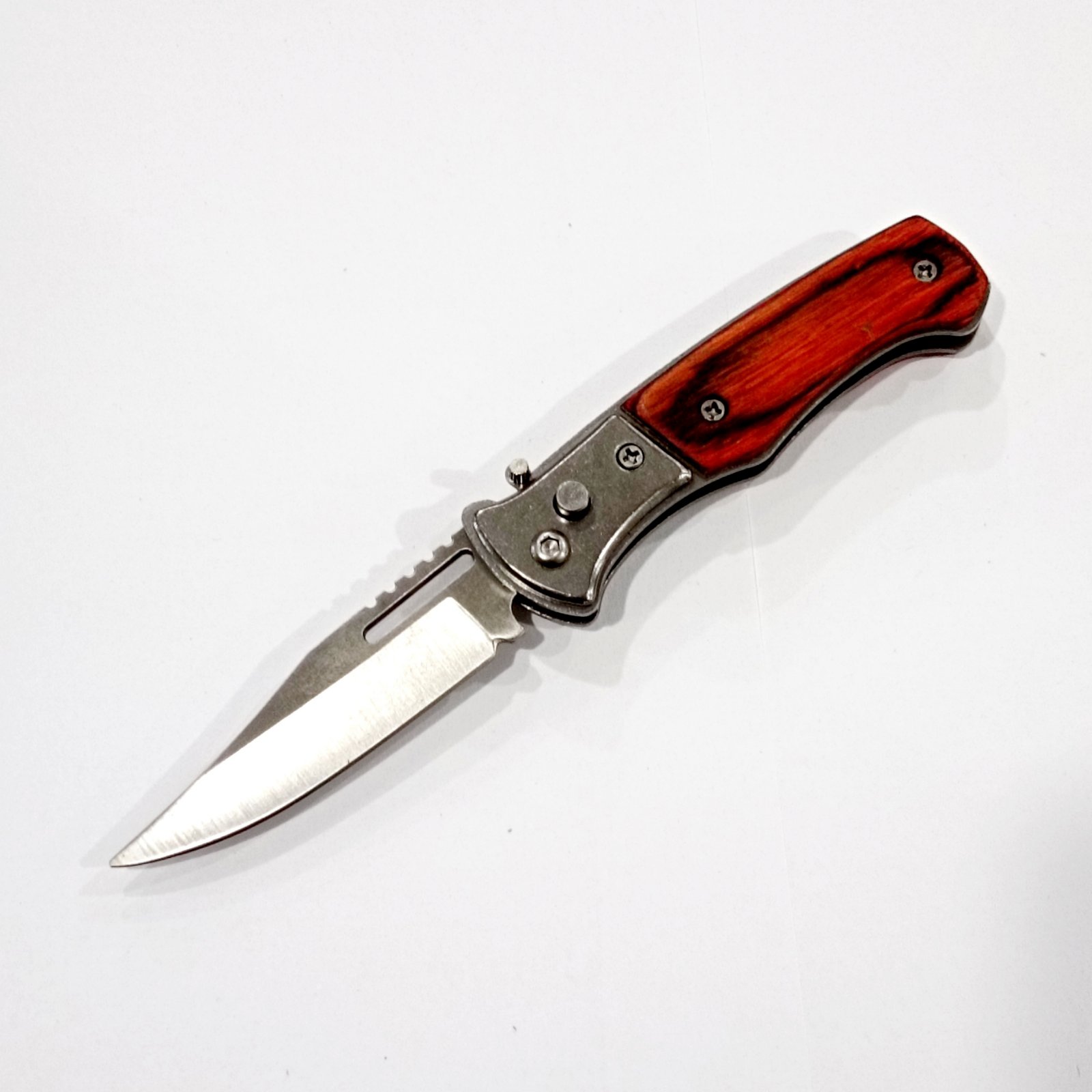 Рукоять ножа виконана з темного дерева, що надає йому стильний та якісний вигляд. Вона зручна для хвату і не ковзає в руках, що особливо важливо в умовах обмеженого простору або в екстрених ситуаціях. Тип замка Button-Lock забезпечує надійну фіксацію леза в відкритому положенні, що виключає ймовірність випадкового закриття ножа під час роботи. Таким чином, ви можете бути впевненими у своїй безпеці і впевненості в кожному русі.