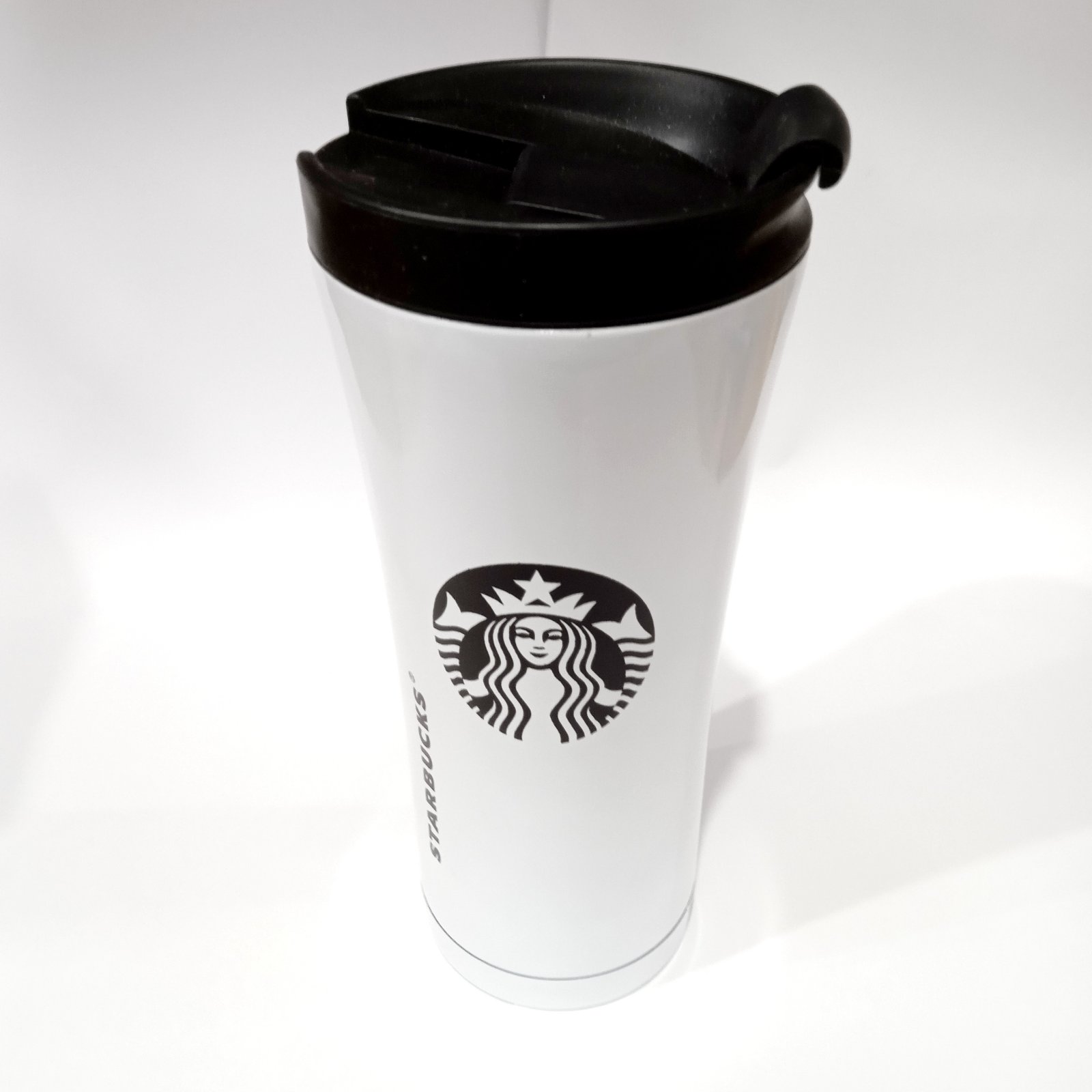Термокружка с двойными стенками, крышка с поильником. Изображен логотип фирмы Старбакс. Упакован термос в коробку.