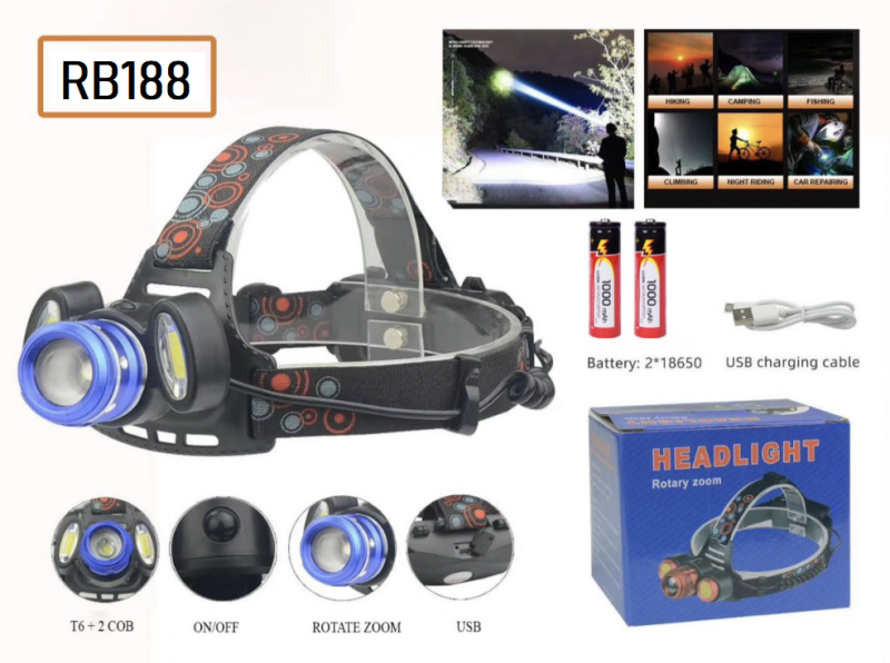 Фонарь налобный RB188/BL-150-T6+COB — идеальный помощник для поиска в темноте, outdoor-активностей и работы. Обеспечьте себе надежный свет и комфорт, выбрав данную модель!