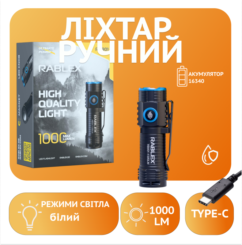 Фонарь ручной Rablex RB901, Li-ion 16340, Zoom, ЗУ Type-C - надежный спутник для ваших приключений