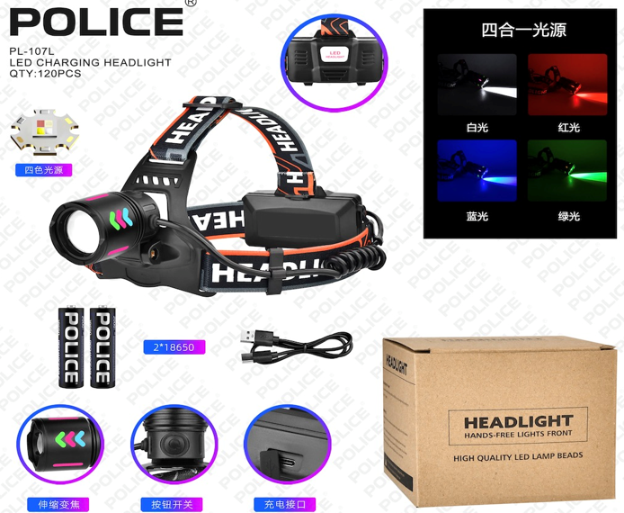 Налобный фонарь Bailong PL-107L, Red+Green+Blue+White, 2x18650, Type-C, TG LED, Zoom Оптом