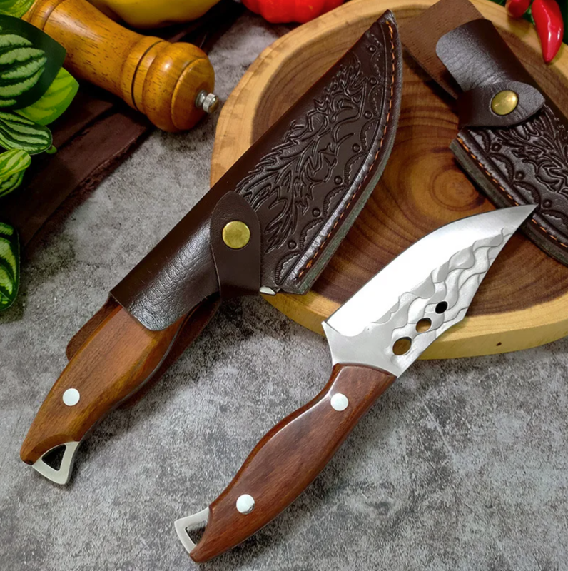 Ручка ножа изготовлена из дерева темного цвета, что придаёт ему элегантный и стильный вид. Кроме того, древесина обеспечивает комфортный и надежный захват, что особенно важно в условиях охоты. Нож оснащен специальными ножнами, что позволяет удобно носить его при себе и защищает лезвие от повреждений.