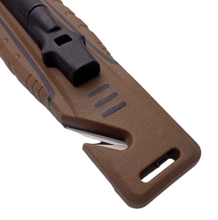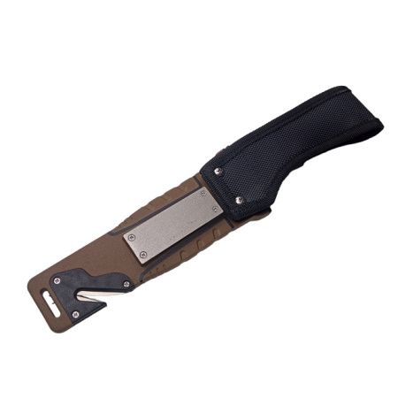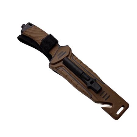 Материал рукояти выполнен из резины, что обеспечивает надежный захват и комфортное использование в любых погодных условиях. Цветовая гамма ножа представлена в коричневом оттенке, что делает его стильным и современным аксессуаром для охотников и любителей экстремального отдыха. Дополнительные функции, такие как огниво, стеклобой и стропозер, дают возможность применять нож в самых разнообразных ситуациях.