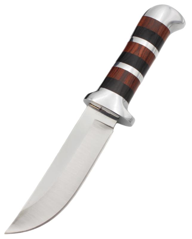 Рукоятка ножа сделана из тёмного дерева, что значительно улучшает тактильные ощущения и гарантирует надежный хват даже в условиях высокой влажности. Эстетичный внешний вид рукоятки добавляет солидности и стильности, что подчеркивает статус владельца во время охоты.