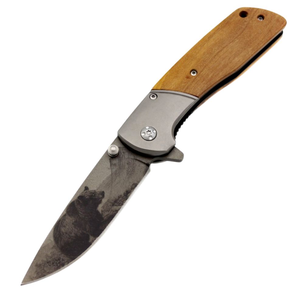 Рукоять ножа выполнена из качественного материала и имеет длину 11.5 см, что обеспечивает уверенный и комфортный хват. Доступные цветовые решения — светлое дерево и серый — придают ножу стильный и современный вид, что делает его отличным аксессуаром для любого мужчины. Приятный на ощупь материал рукояти не скользит в руках, позволяя использовать нож в любых условиях.