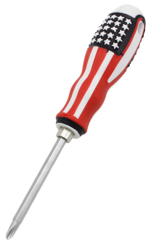 Отвёртка двухсторонняя с резиновой ручкой в оригинальном дизайне "Американский флаг" – это идеальный инструмент для домашнего мастера и профессионала. Она сочетает в себе удобство, стиль и функциональность, что делает её отличным дополнением к любому набору инструмента.