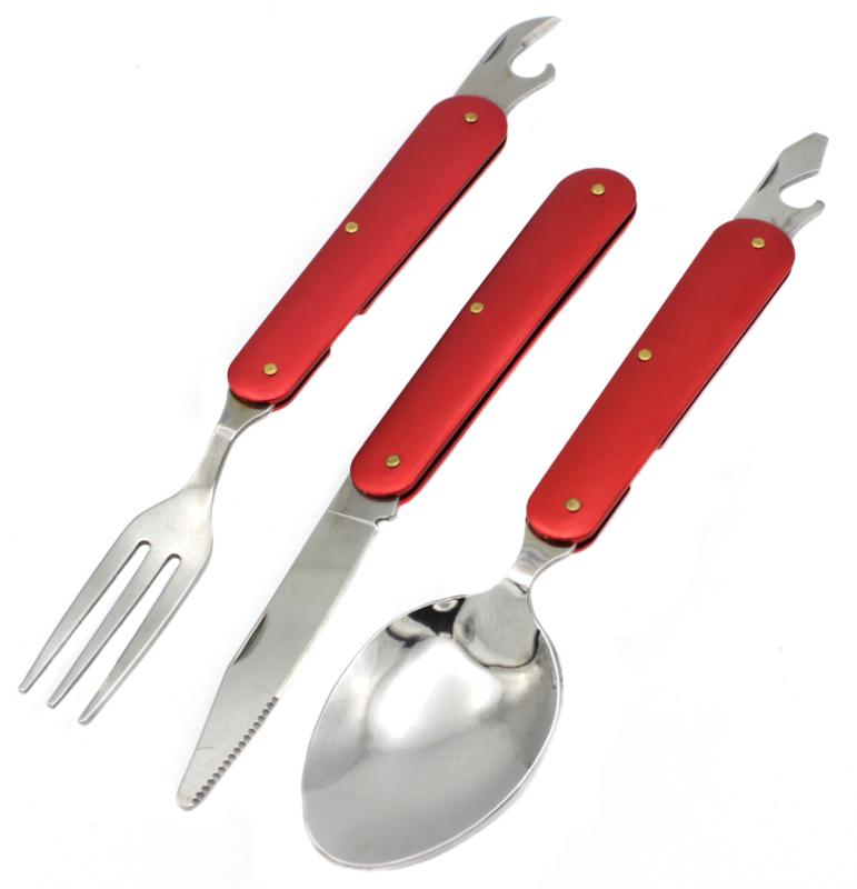 - Комплектация: Включает вилку, ложку, нож и открывалку.